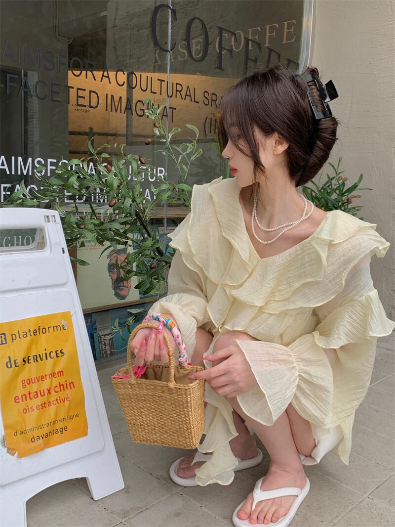 大ぶりフリルが目を引く女性らしさ満点の1着。