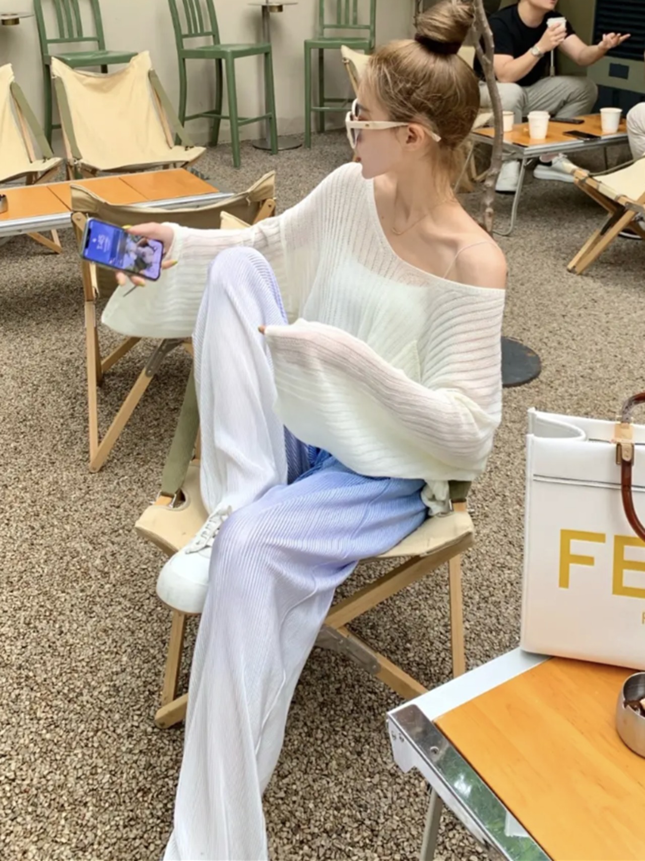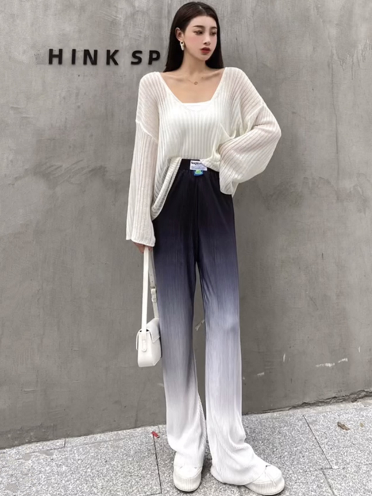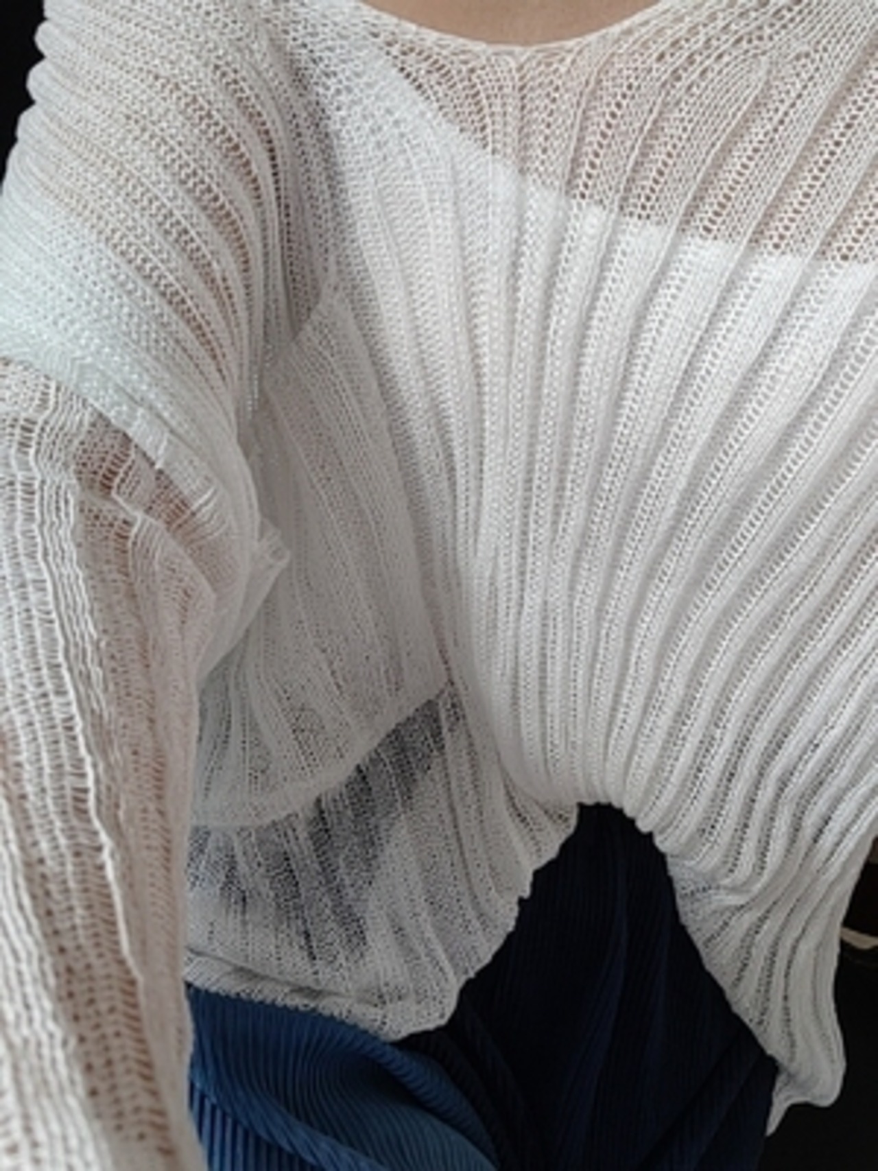 透け感のあるサマーニット+プリーツワイドパンツのセットアップ。