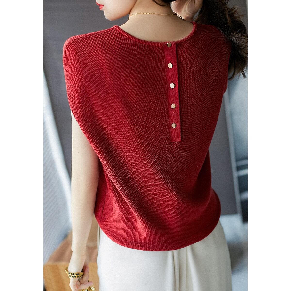 背中部分にはボタンがあしらわれ、シンプルながらもハイセンスなおしゃれが楽しめますよ。