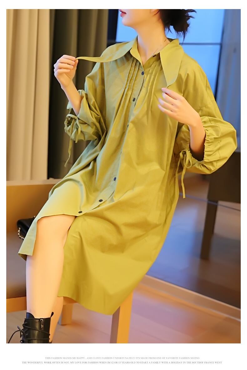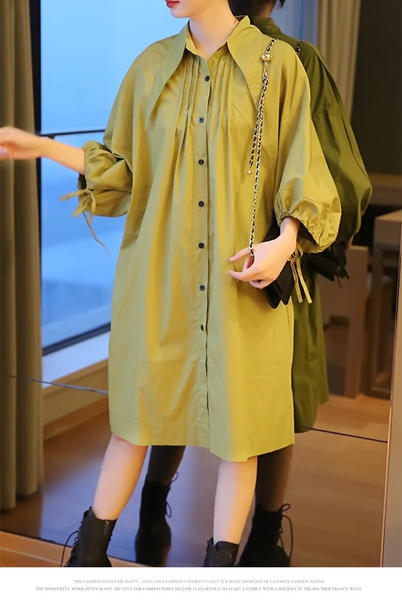 シャツワンピース バルーンスリーブ 七分袖 大きいサイズ 袖リボン 袖コンシャス 襟コンシャス 春夏 かわいい 膝下丈 10代 20代 30代 op0734