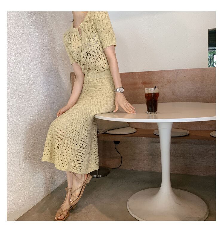半袖ニットカーディガン+スカートのセットアップアイテム。