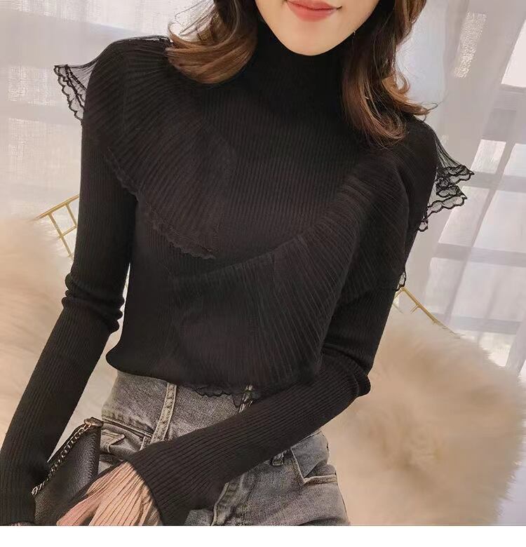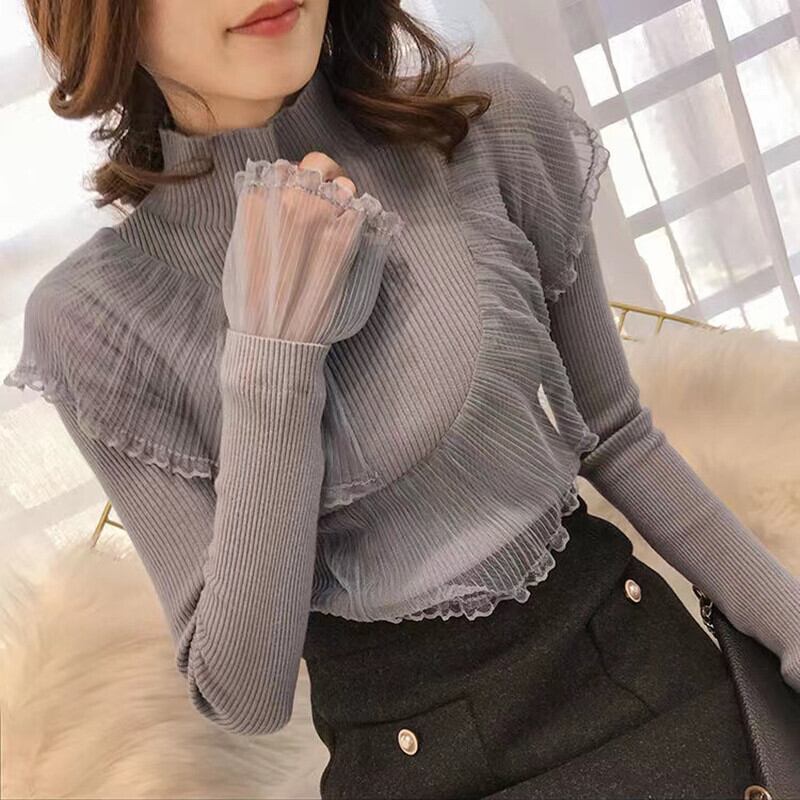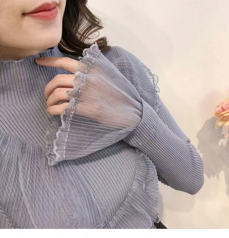 リブニット 透け感 シアーフリル 大人きれい チュール ハイネック 長袖 春秋 10代 20代 30代 40代 50代 tp1165