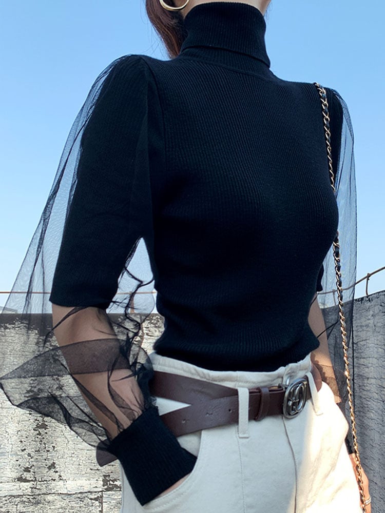 リブニット シアースリーブ タートルネック 透け感 メッシュスリーブ 長袖 春秋 大人きれい 10代 20代 30代 40代 tp1170