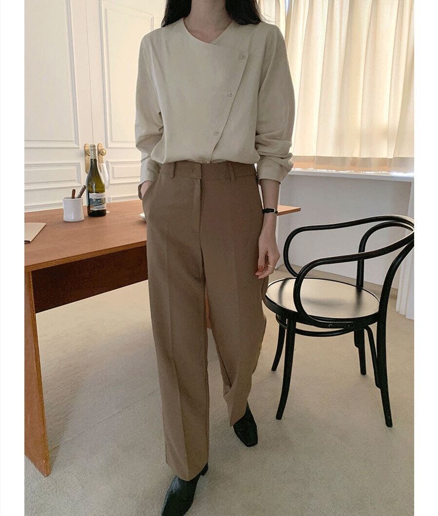 ボタンの配置がアシンメトリーになっているデザインのブラウス。