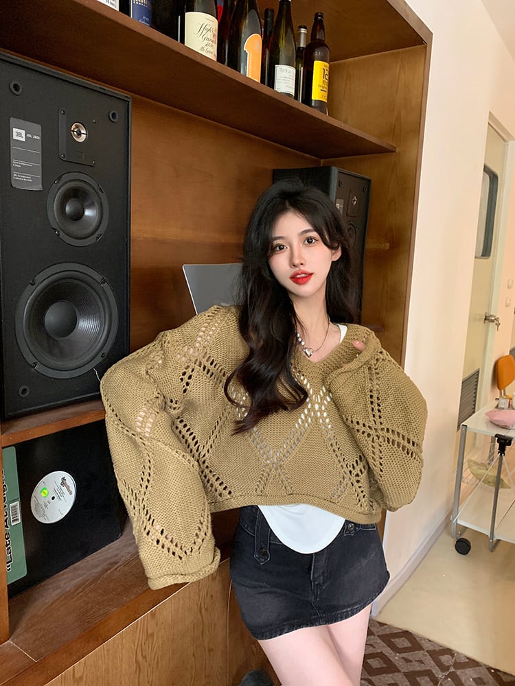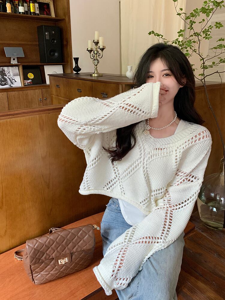 ショート丈ニット 薄手 長袖 Vネック カジュアルガーリー 春秋 10代 20代 30代 tp1189