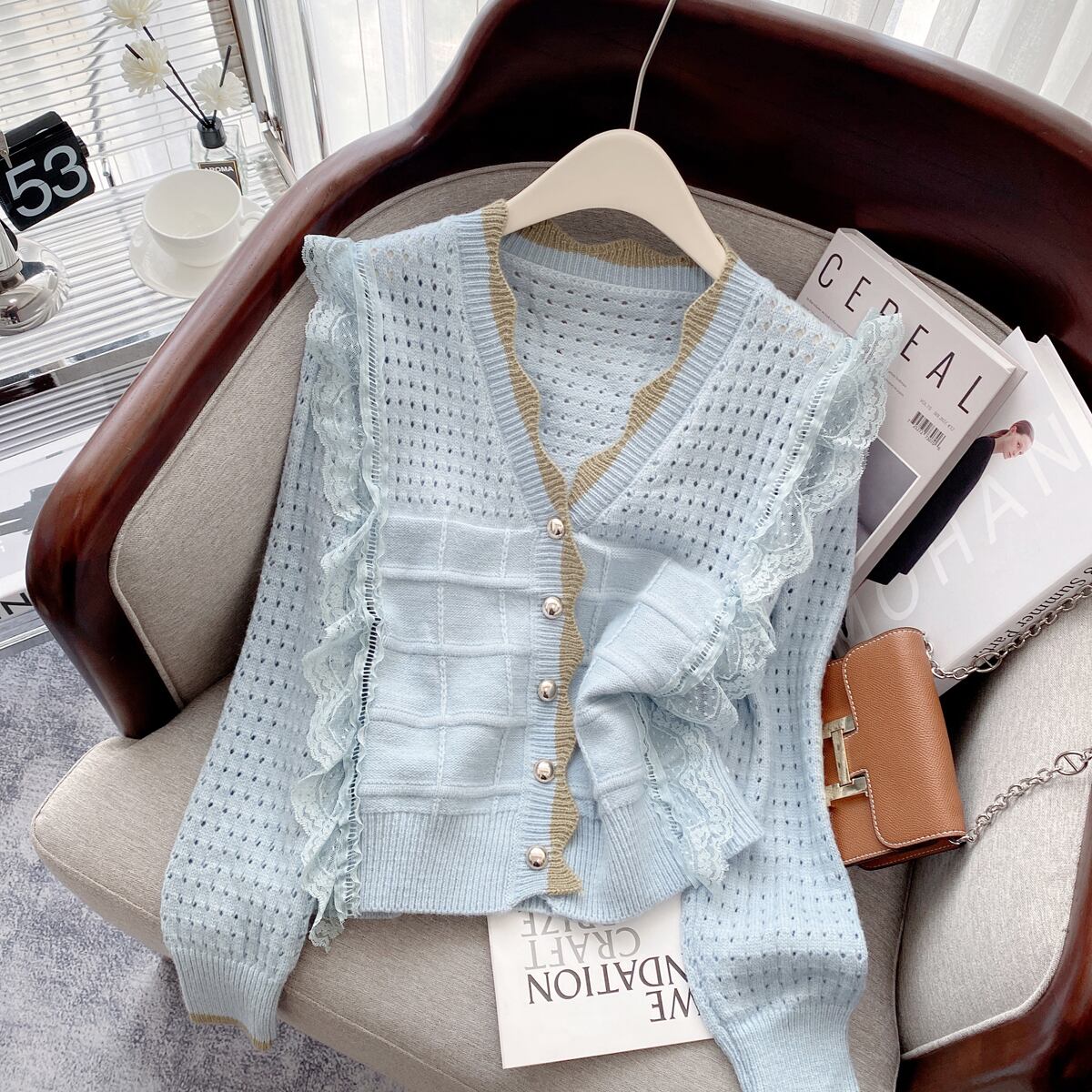 デザインカーディガン レース Vネック 長袖 透かし編み ガーリー 春秋 10代 20代 30代 40代 tp1187