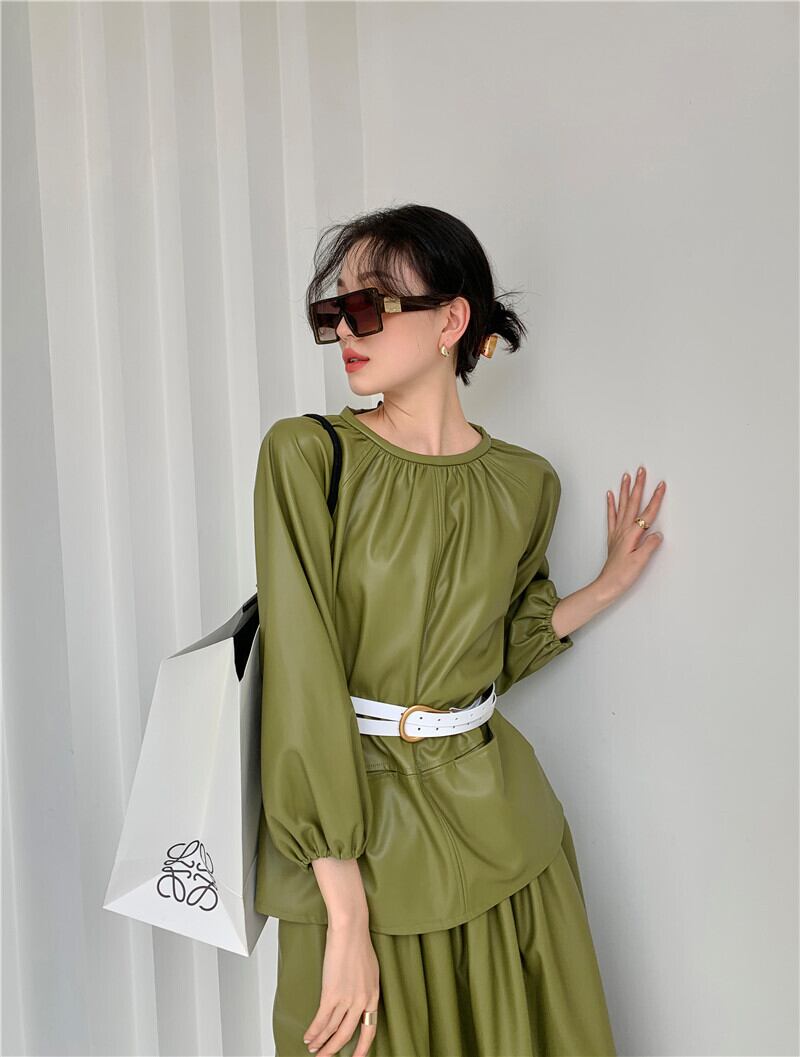 【セットアップ】フェイクレザー プルオーバー フレアスカート 七分袖 ミモレ丈 合皮 春秋 大人きれい 20代 30代 40代 st0349
