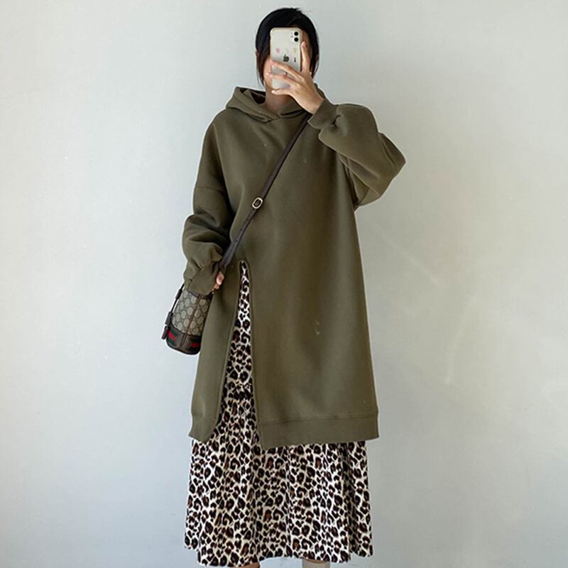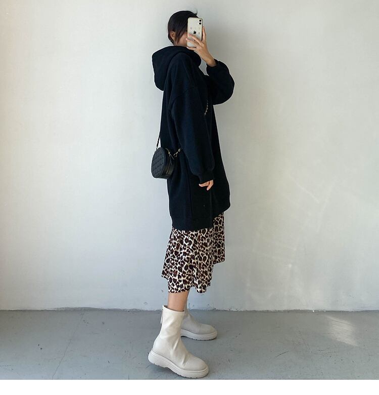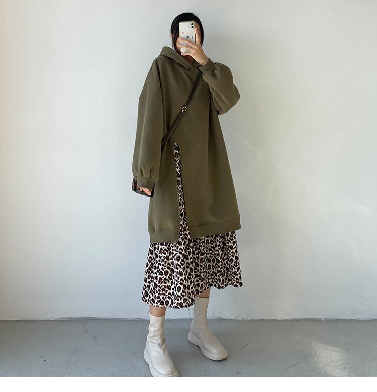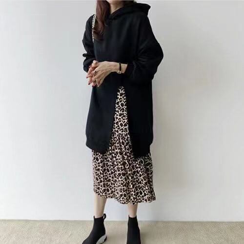 レイヤード レオパード ワンピース 重ね着風 長袖 フード付き 秋冬 ミモレ丈 20代 30代 40代 op0763