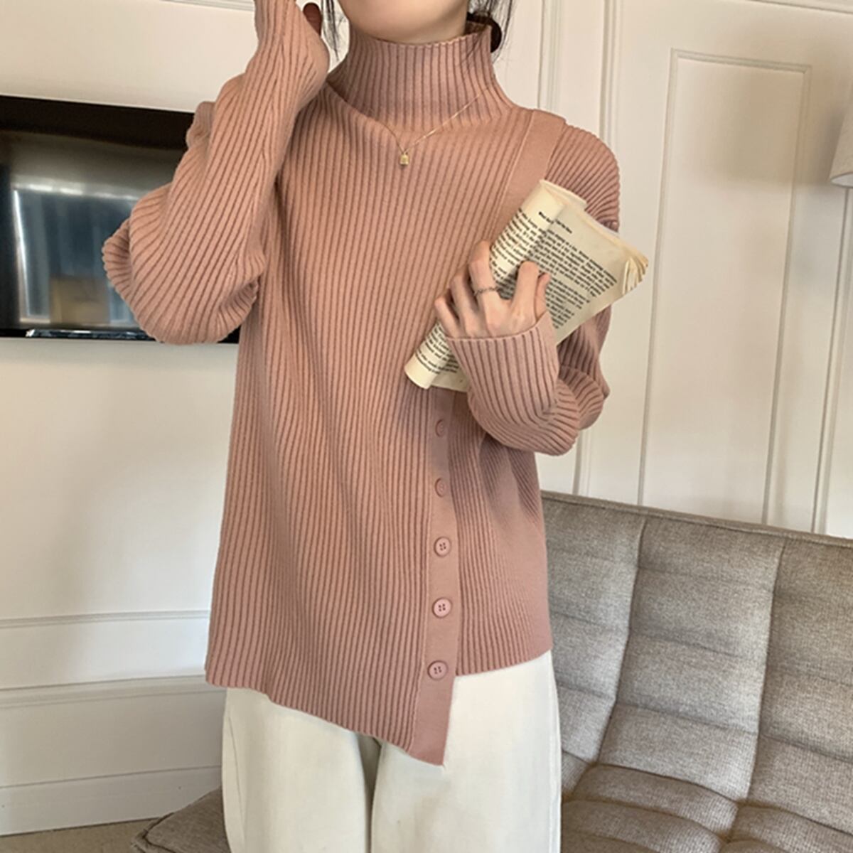 アシンメトリーハイネックリブニット ボタン 秋冬 大人きれい 20代 30代 40代 50代 tp1218