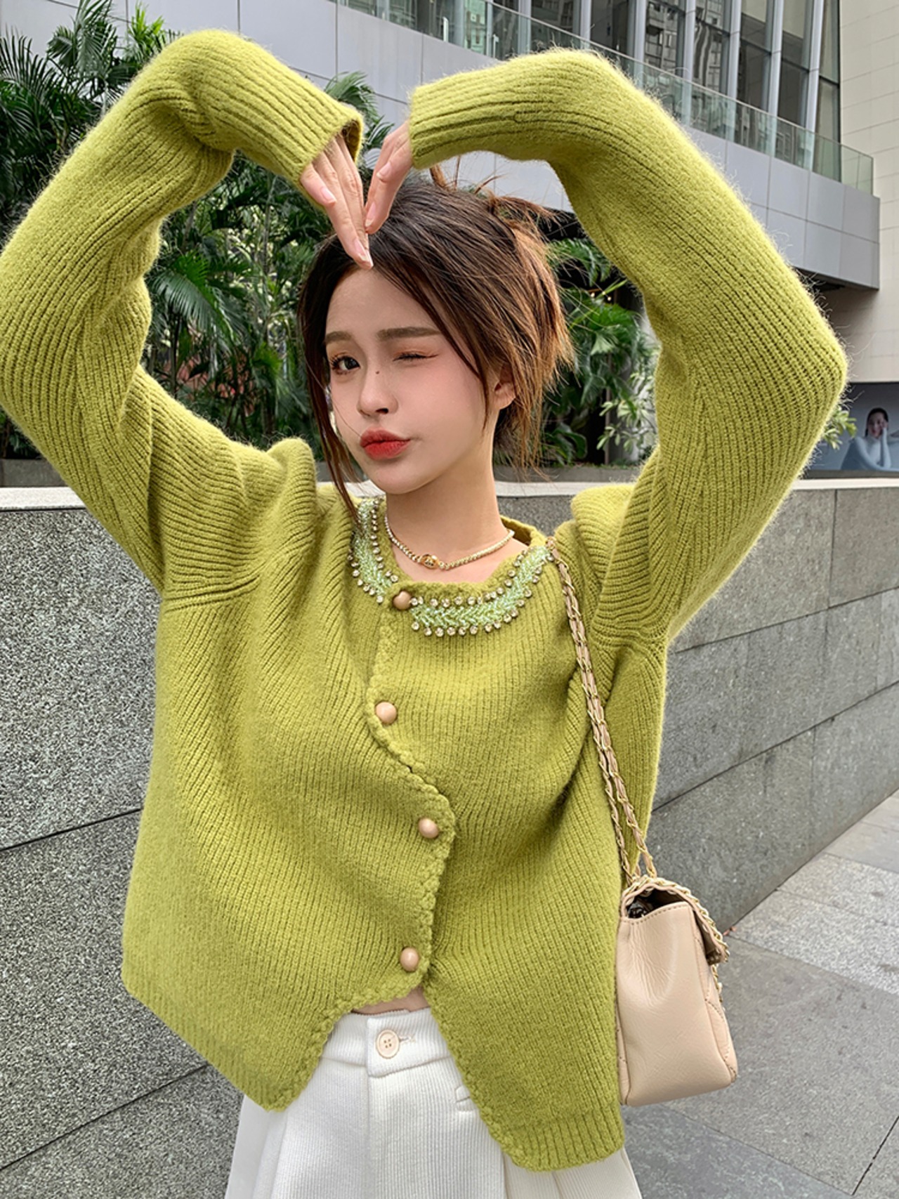 合わせ部分が変形になっているアシンメトリーカーデ。