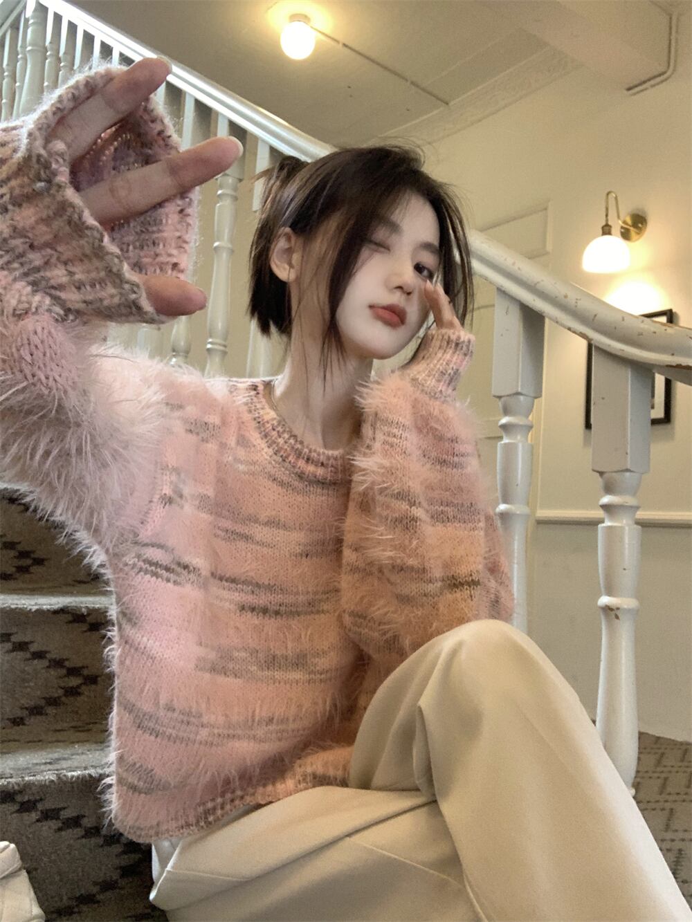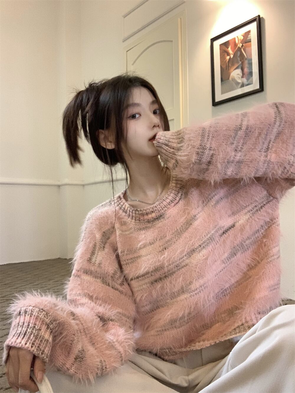 マーブルカラーニット ショート丈 ラウンドネック 起毛 長袖 秋冬 20代 30代 tp1245