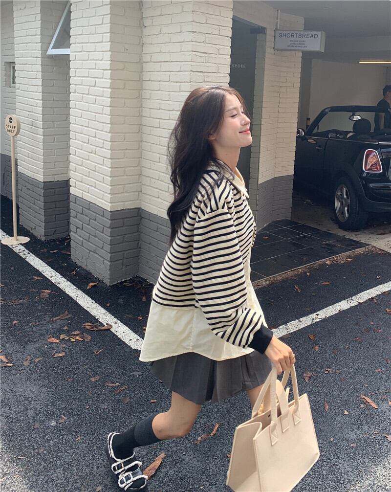 重ね着風ボレロブラウス シャツ ティアード ボーダー柄 長袖 春秋 大人カジュアル 20代 30代 40代 tp1249