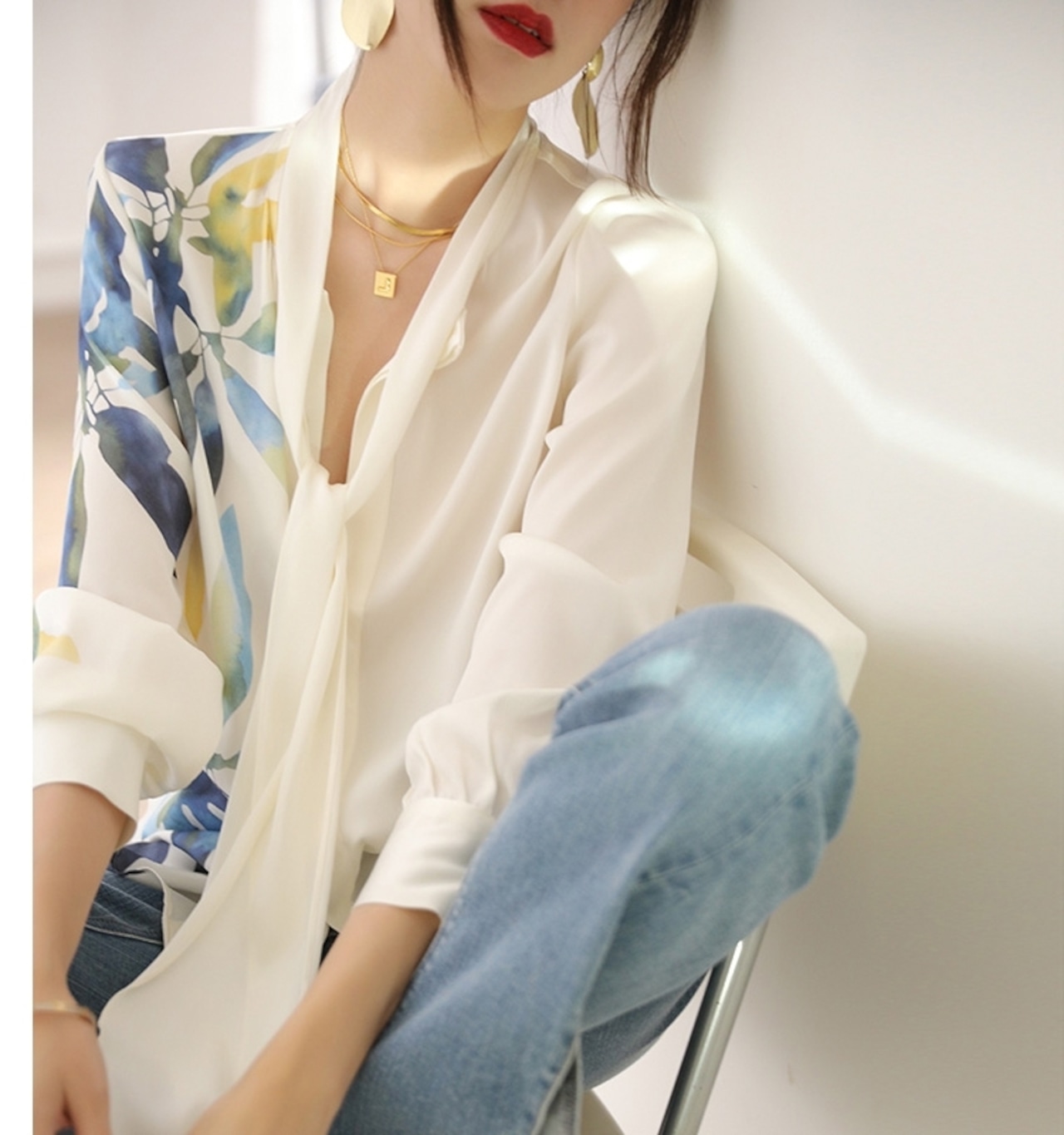 リーフ柄プリントシフォンブラウス シャツ 襟付き ボウタイ シルク混 長袖 秋春 大人きれい 20代 30代 40代 tp1261