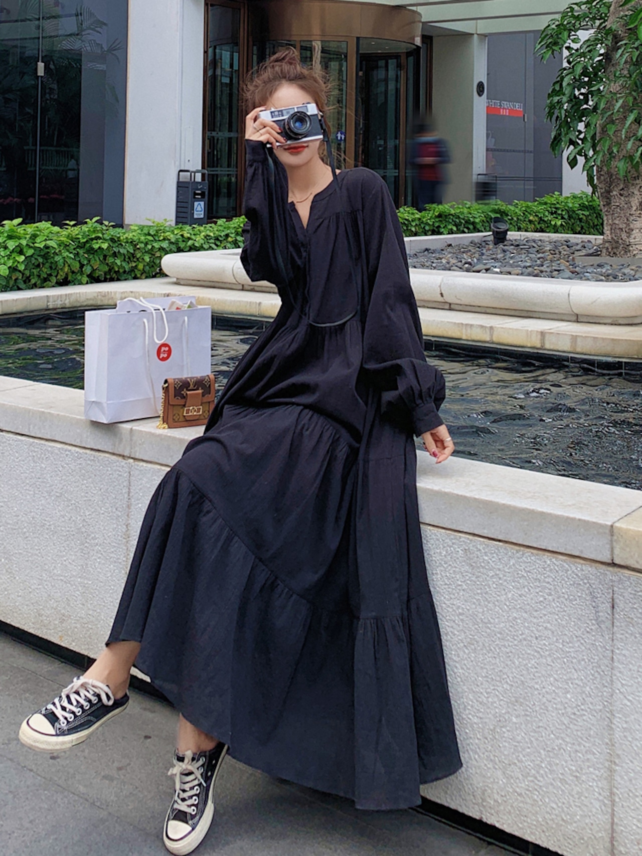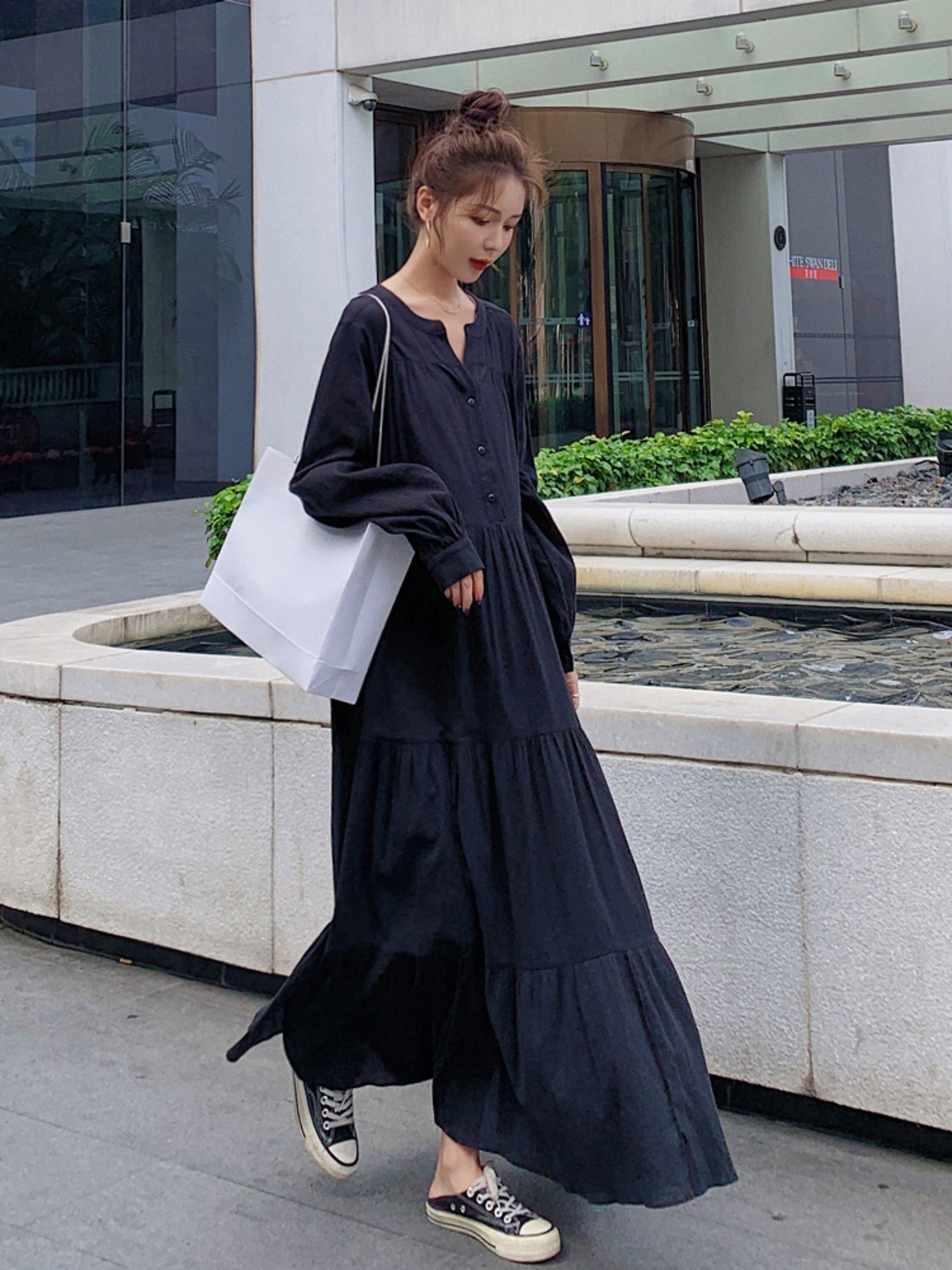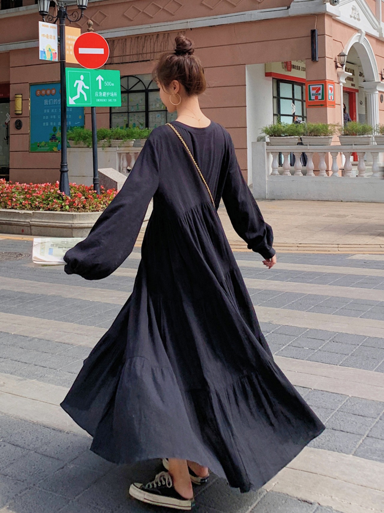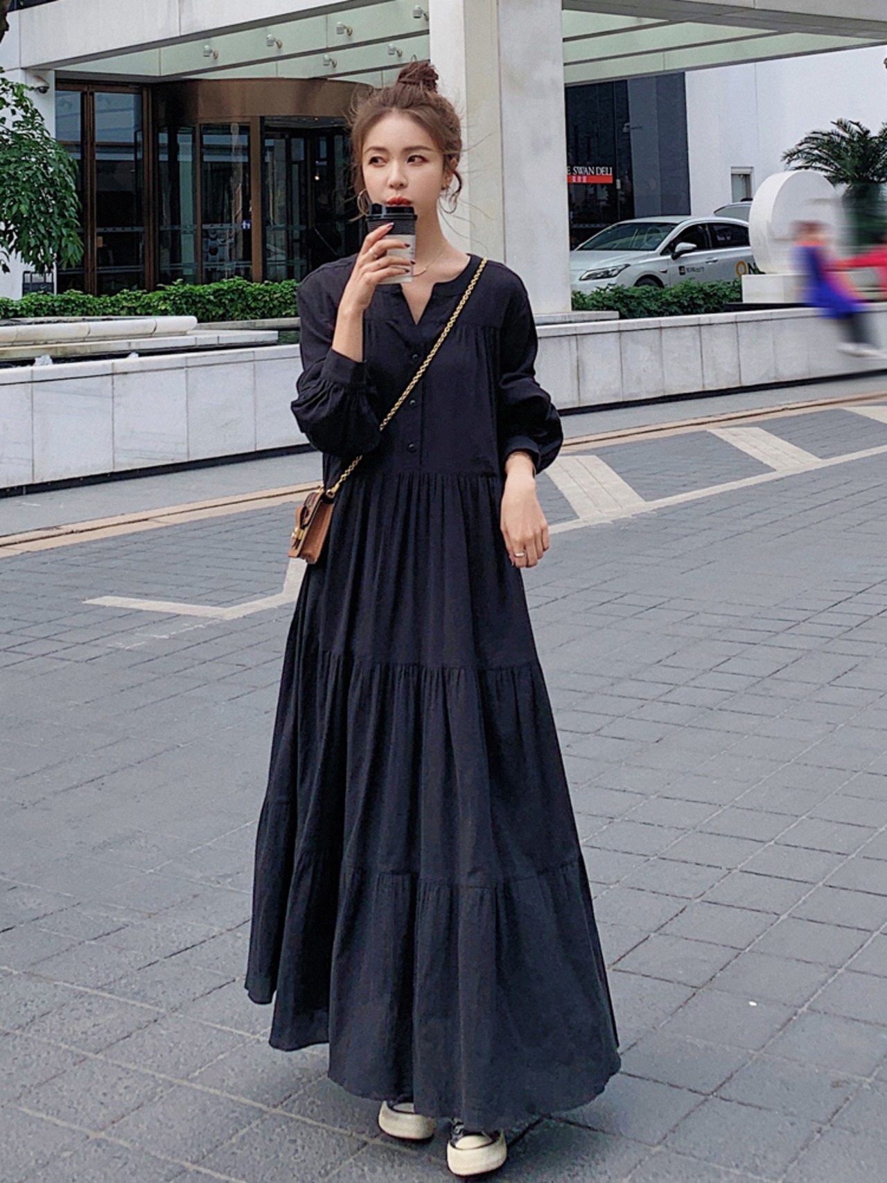 ティアードワンピース キーネック コットンリネン ロング丈 長袖 春秋 大人かわいい 10代 20代 30代 op0793