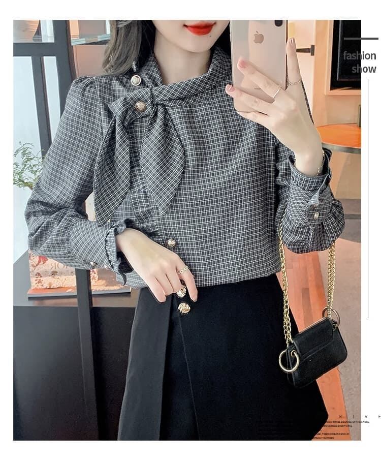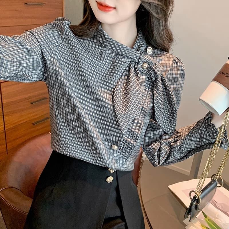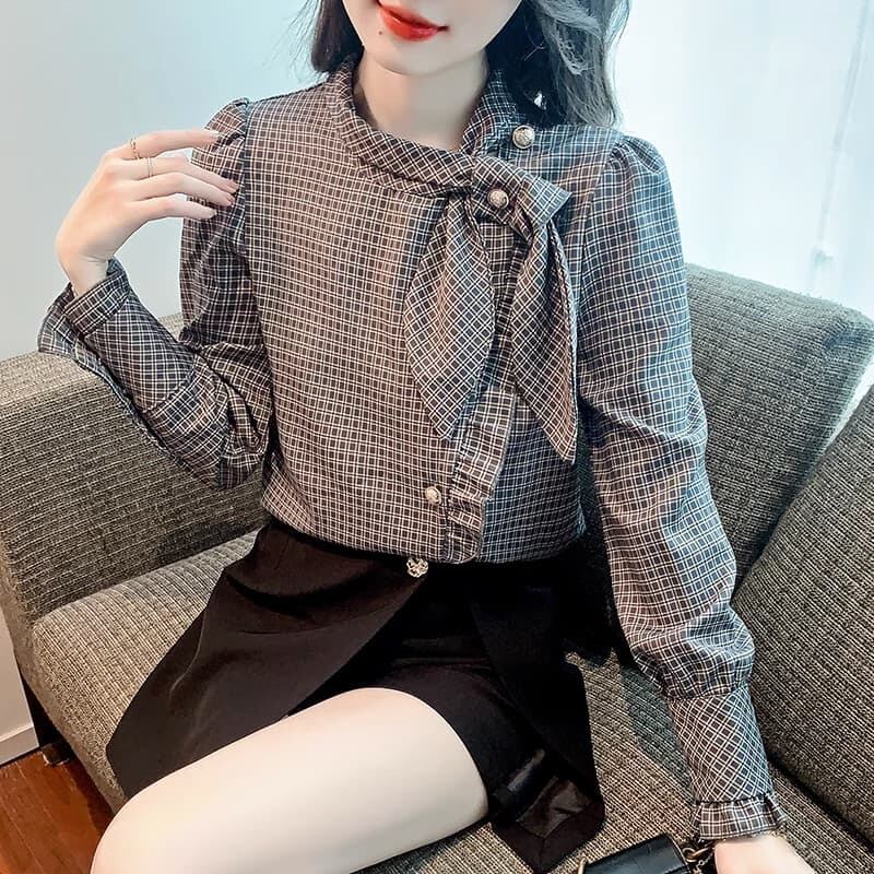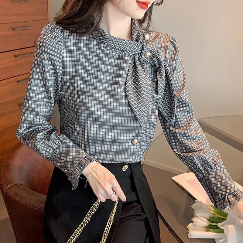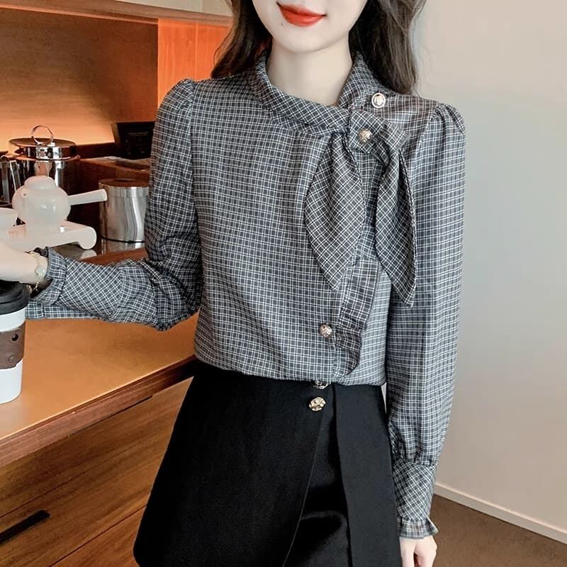 【秋物入荷】チェック柄ブラウス リボンタイ シャツ アシンメトリー 春秋 長袖 大人きれい クラシカル レトロかわいい 20代 30代 40代 tp1311