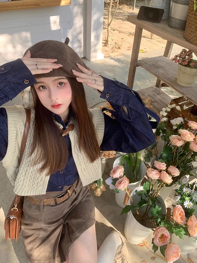 【2点セット】ダンガリーシャツ スクエアニットベスト ショート丈ジレ 秋冬 プルオーバー 長袖 大人かわいい 20代 30代 40代 tp1319