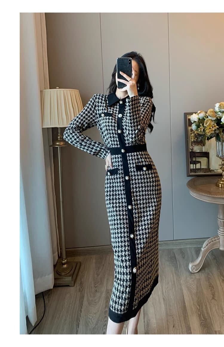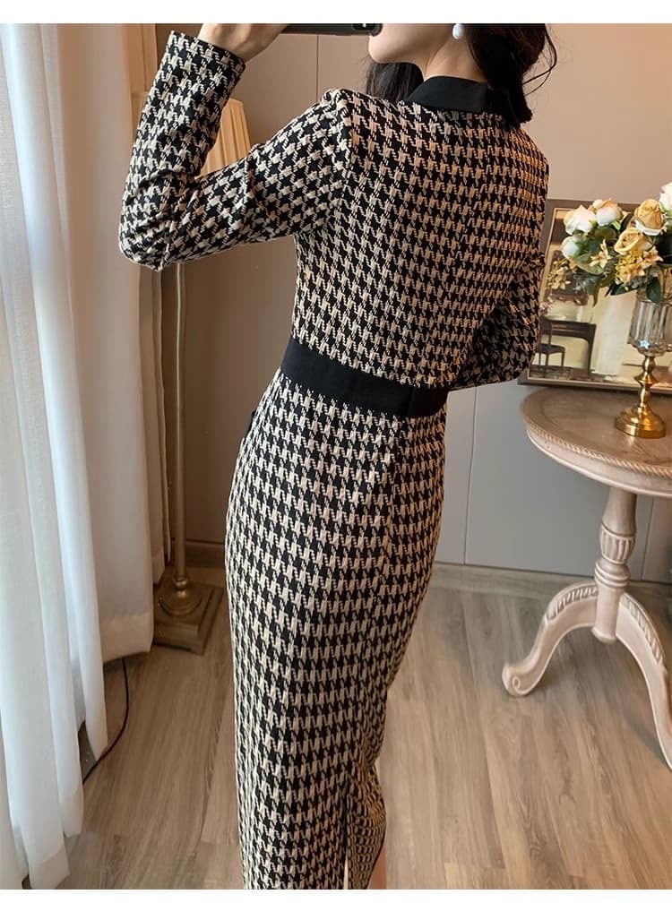 千鳥格子柄 ニットワンピース パールボタン 長袖 襟付き おしゃれ 大人きれい 秋冬 ミモレ丈 30代 40代 50代 op0854