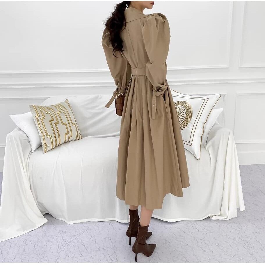 パフスリーブ トレンチ風ワンピース フレアワンピース 春秋 ひざ下丈 長袖 20代 30代 40代 op0855