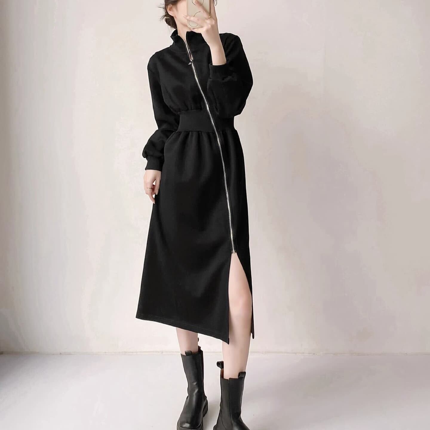 フロントのジッパーがサイドのスリットとつながったハイセンスなワンピース。