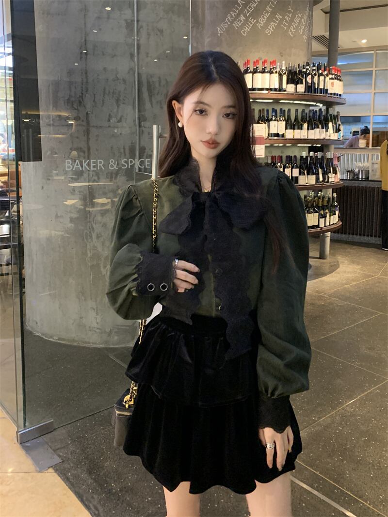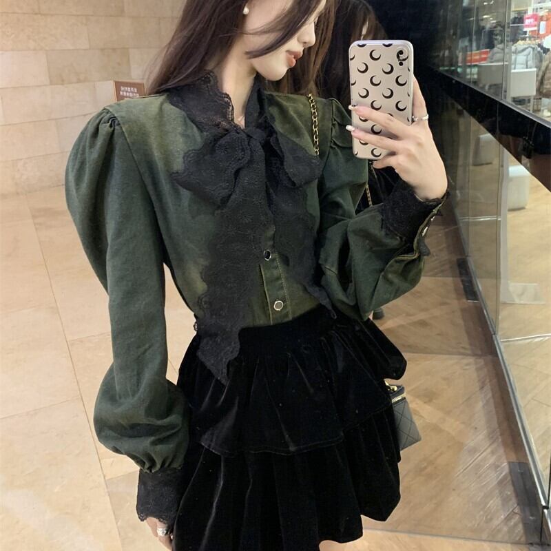 ダンガリーシャツ デニムシャツ パフスリーブ リボン レース 長袖 大人かわいい 20代 30代 40代 tp1352