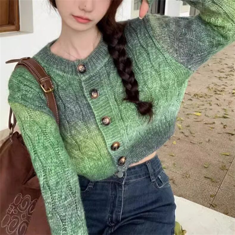 おしゃれで大人かわいい、ショート丈グラデーションニットカーディガンが新登場です!トレンドのグラデーションデザインとラウンドネックの組み合わせは、秋冬シーズンにぴったりなアイテムです。